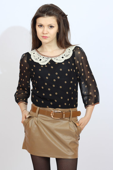 Данная модель блузы из черного шифона в горох, с ажурным воротником белого цвета.